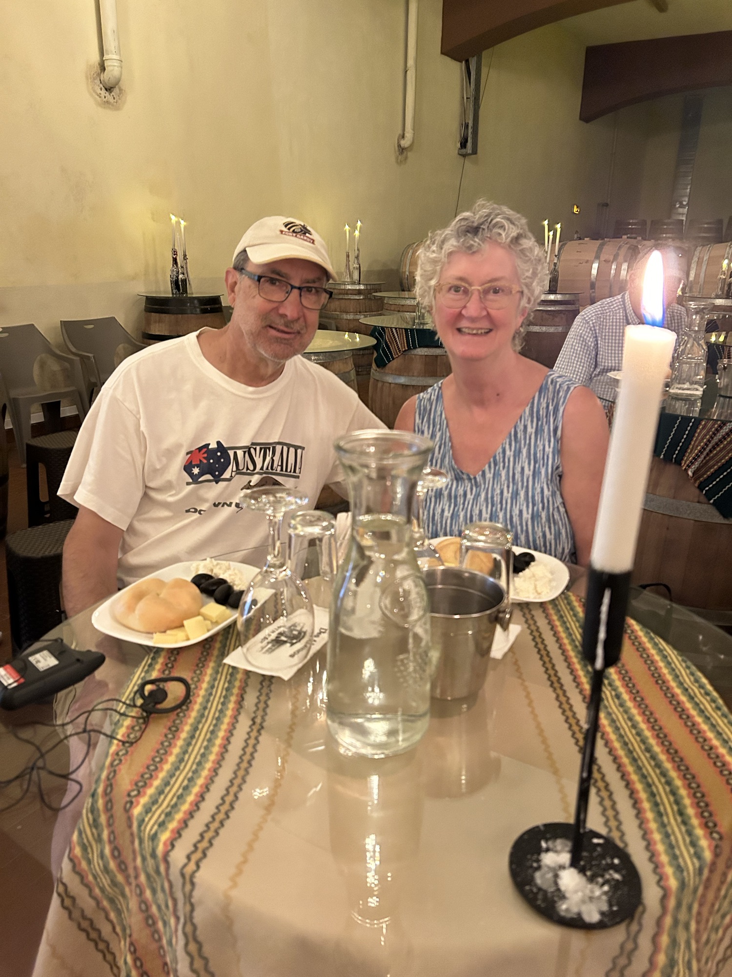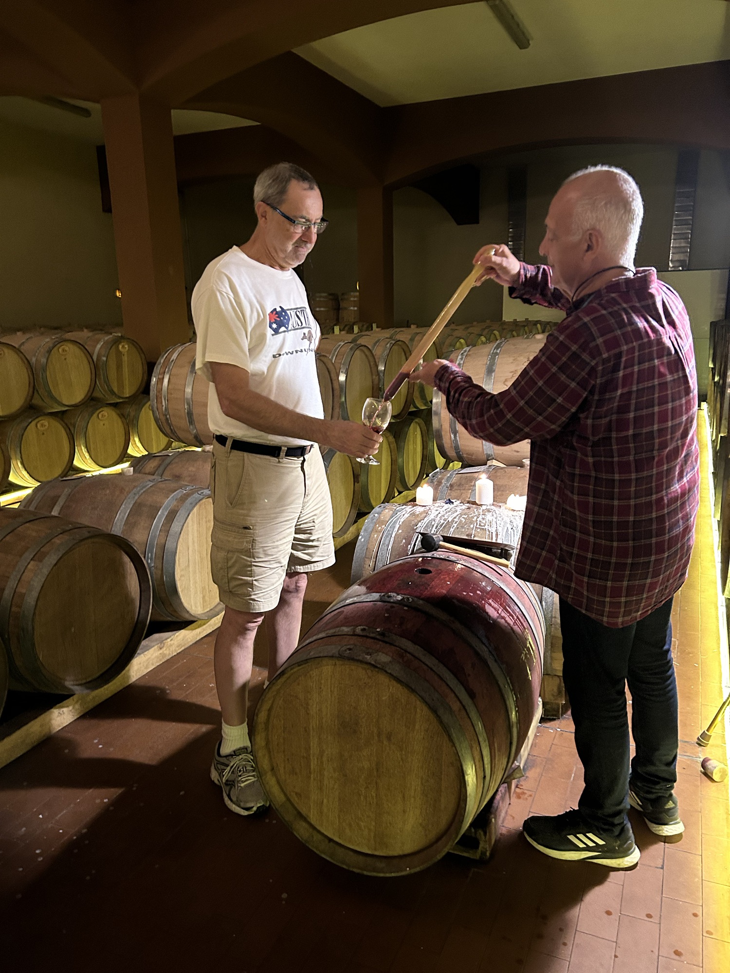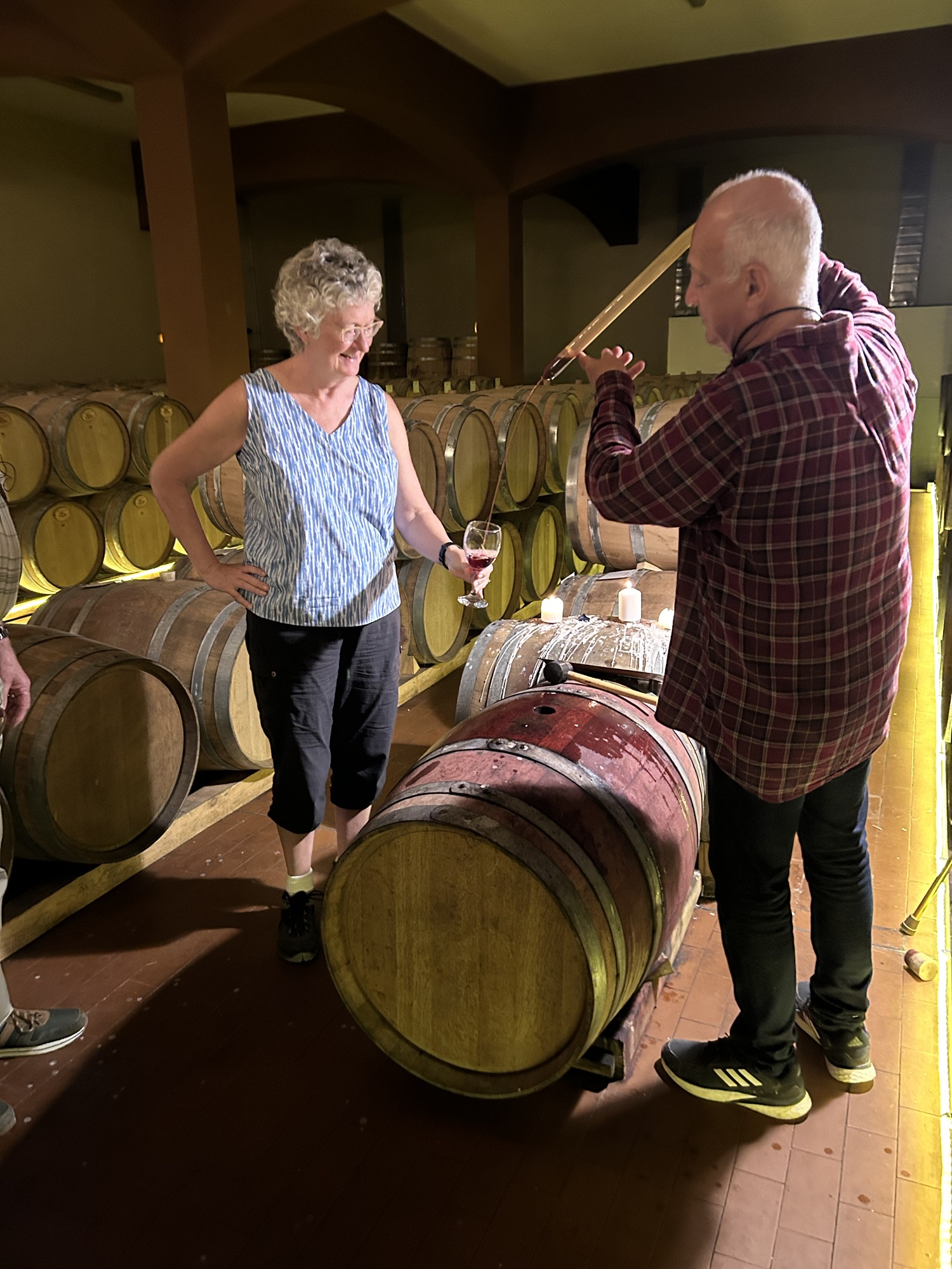 We were led downstairs to a very pretty setting for a wine tasting. We sampled their Sauvignon blanc, rosé from an indigenous grape (salmon fumeé), Ruby red wine from an indigenous grape, which spent 3 years in a barrel and 4 years in a bottle. They use Hungarian and French oak barrels. Finally our host had Dean open a barrel and we had turns to thieve a very tasty red straight from the barrel!