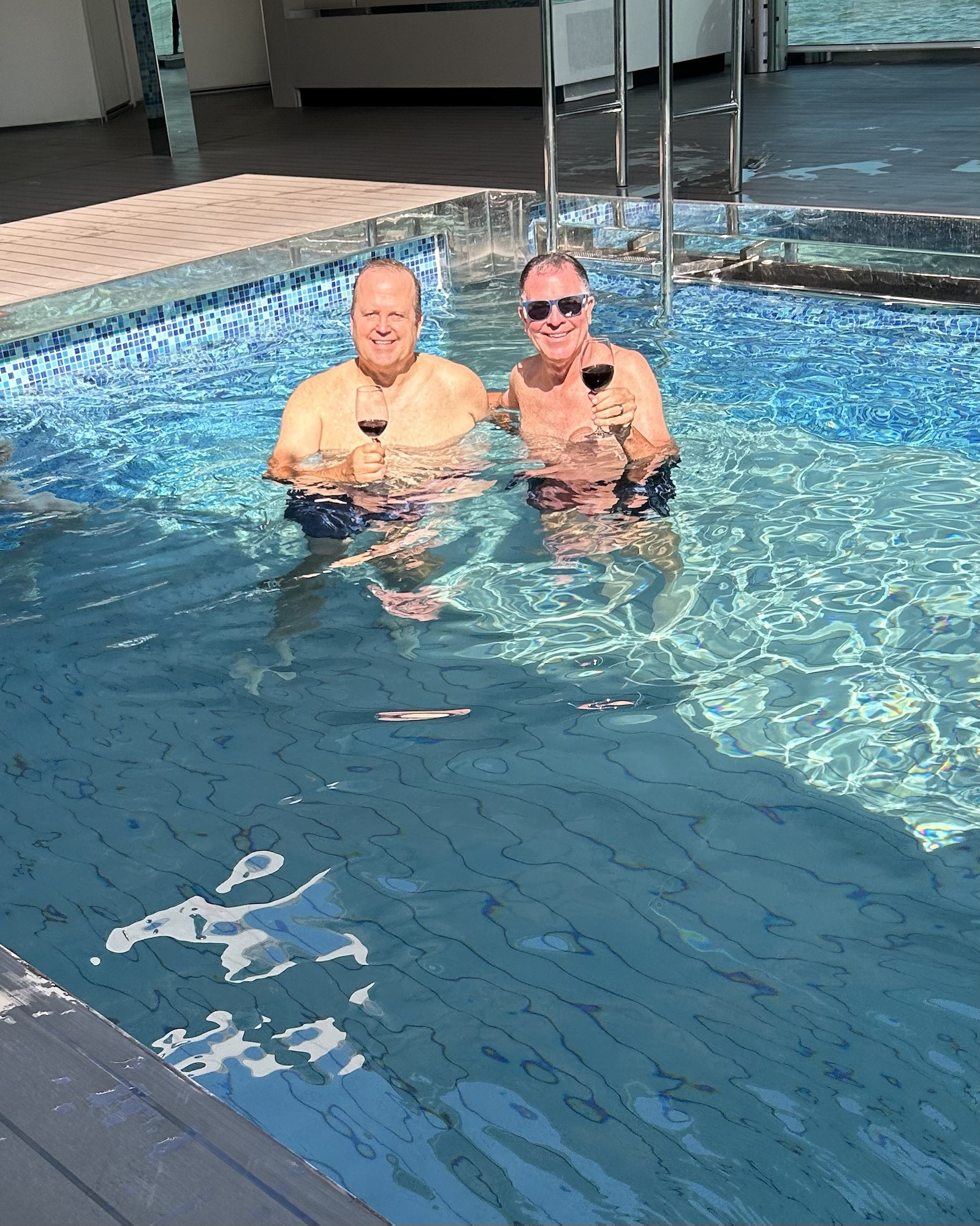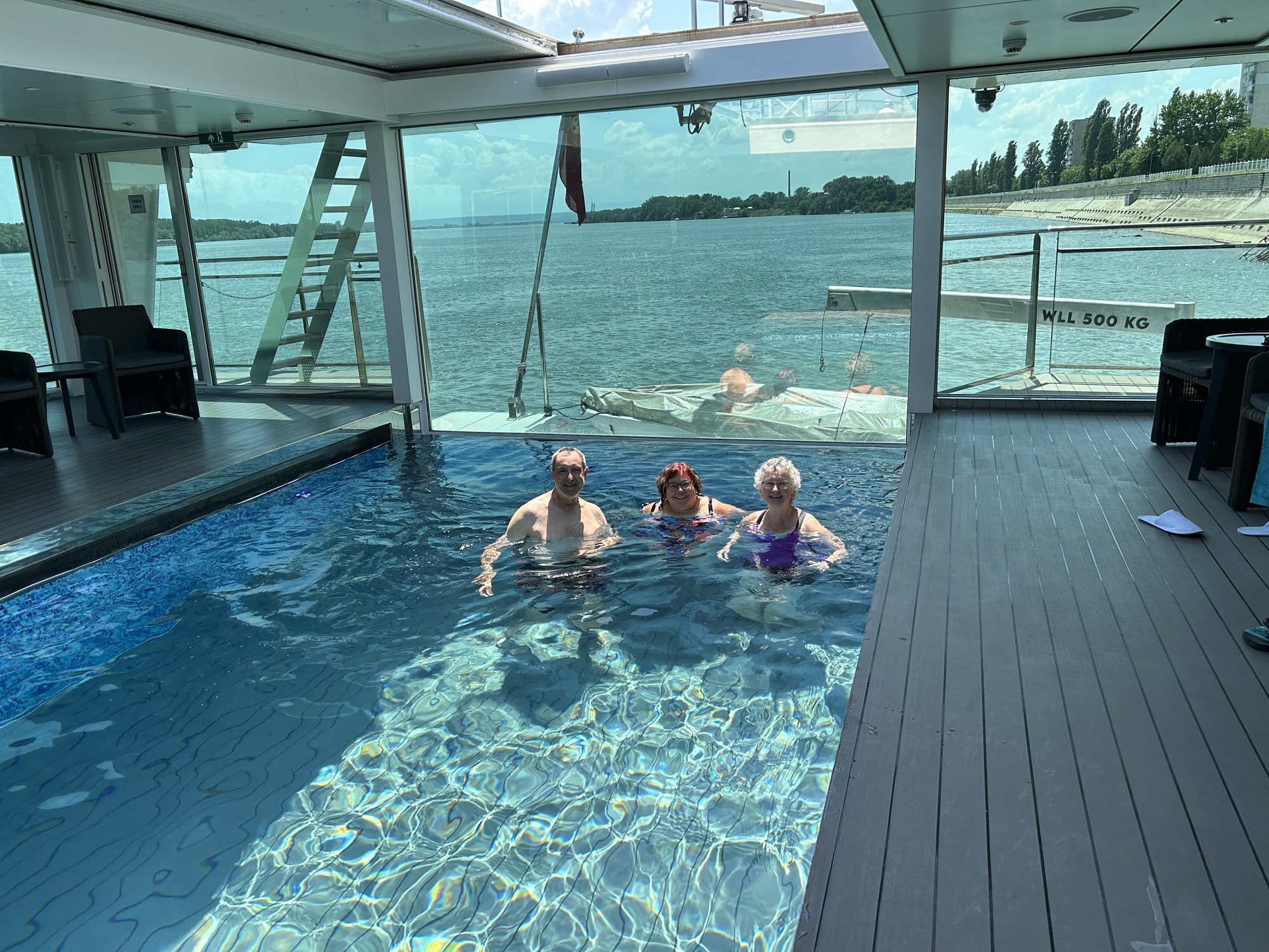 We were back on the ship for lunch and asked for the roof of the pool to be open. We spent a very lovely afternoon at the pool and the lovely waitress Eriska kept us stocked with beer. Jane and Scott from Florida, David and Chris from Dallas were our main company.