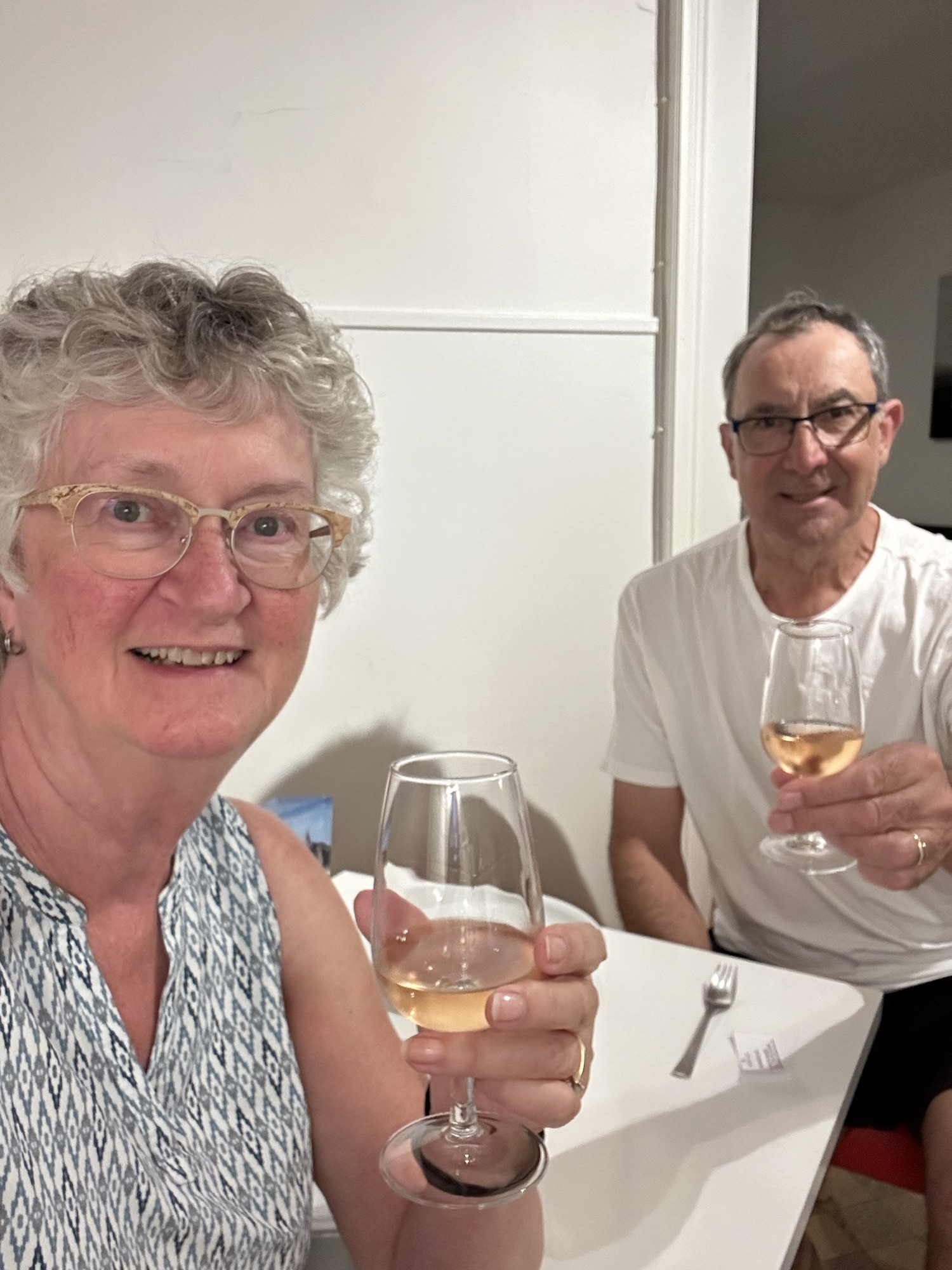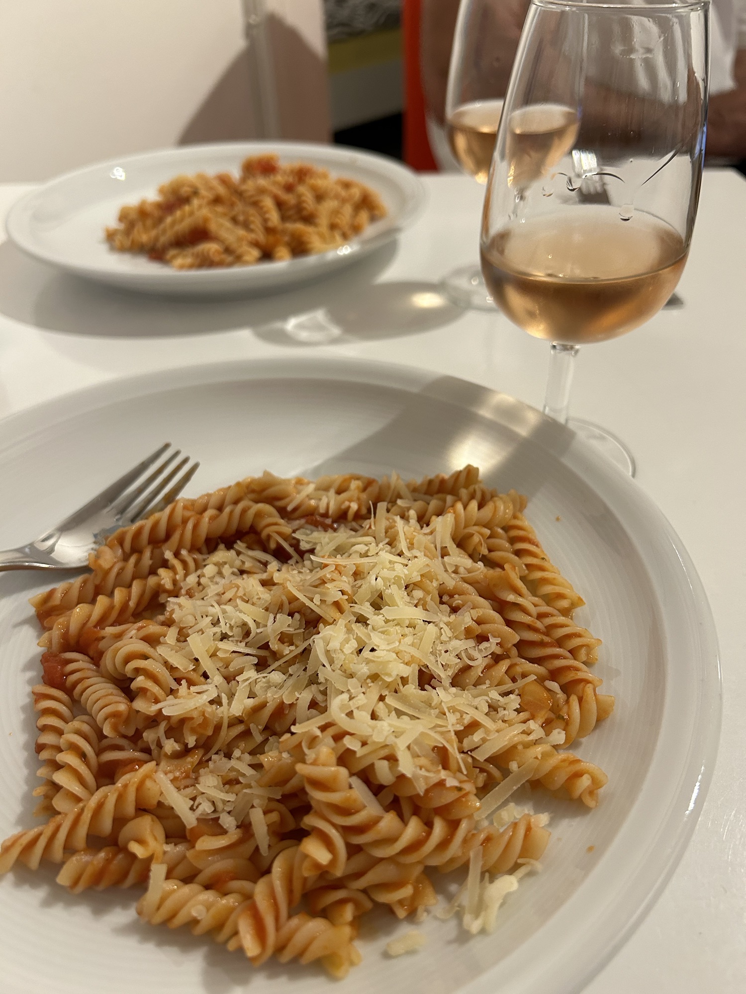 We unpacked and then used umbrellas provided by Therese to walk over to the small grocery store. We bought coffee, cream, sugar, yogurt (I think), a banana, and a croissant for breakfast. We also wanted something simple for dinner, so we went from being presented with gourmet, delicious meals on the ship, to eating fusilli with Barilla marinara sauce and shredded Gruyère (I mean, we ARE in Switzerland) cheese! Also delicious and very satisfying. The common denominator might be that we were drinking rosé wine!